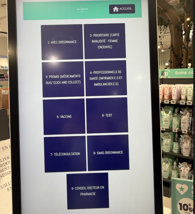 Ainsi, un visiteur qui se rend à la pharmacie, se dirige vers la borne tactile et choisit le motif de sa visite